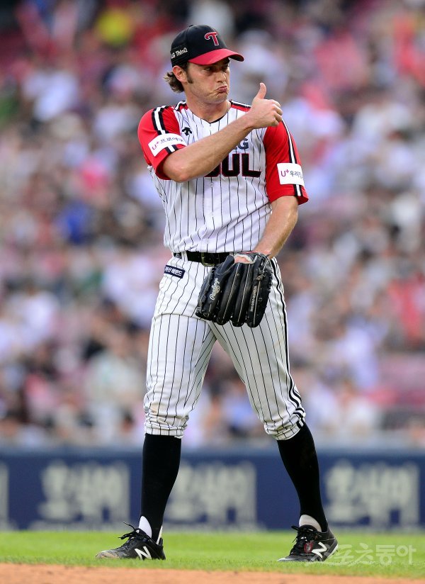 4회초 1사에서 두산 최주환을 투수 앞 내야땅볼로 아웃시킨 LG 선발 윌슨이 포수를 향해 손짓하고 있다.