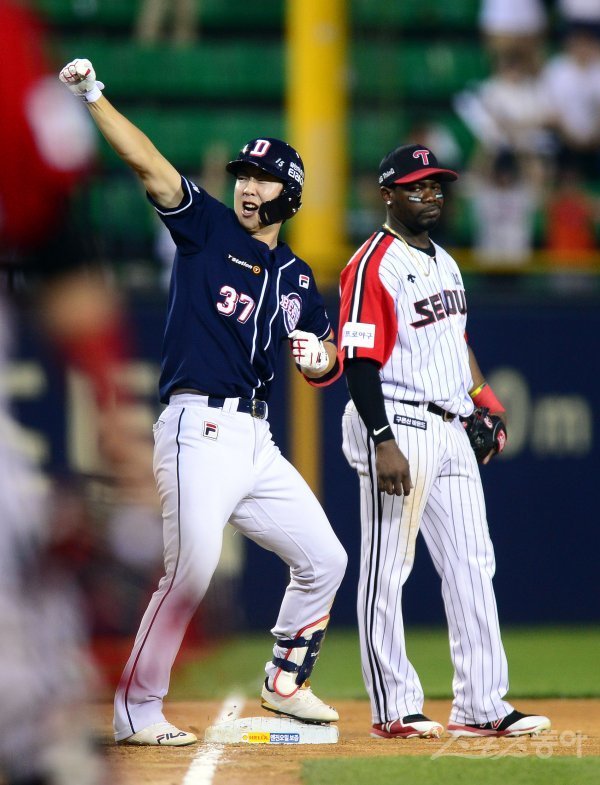 7회초 2사 2, 3루에서 두산 대타 박건우가 2타점 역전 3루타를 날린 뒤 환호하고 있다.
