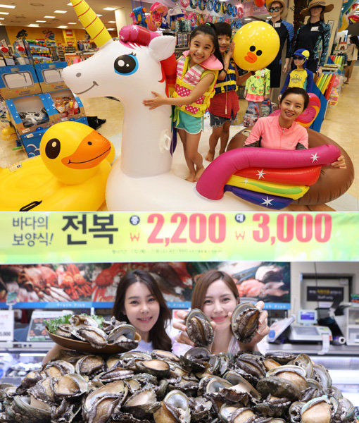 유통업계가 연일 계속되는 폭염을 조금이나마 식혀줄 다양한 할인 행사에 나섰다. 이마트가 판매하는 물놀이 용품(위쪽)과 롯데마트가 선보인 보양식 전복. 사진제공|이마트·롯데마트