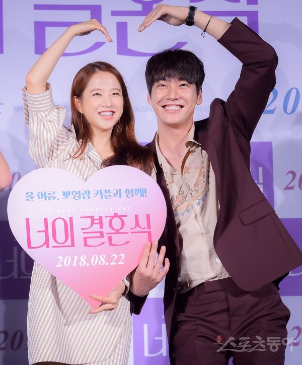 이석근 감독과 배우 박보영과 김영광(왼쪽부터)이 23일 서울 중구 메가박스 동대문에서 열린 영화 ‘너의 결혼식’ 제작보고회에서 포즈를 취하고 있다.