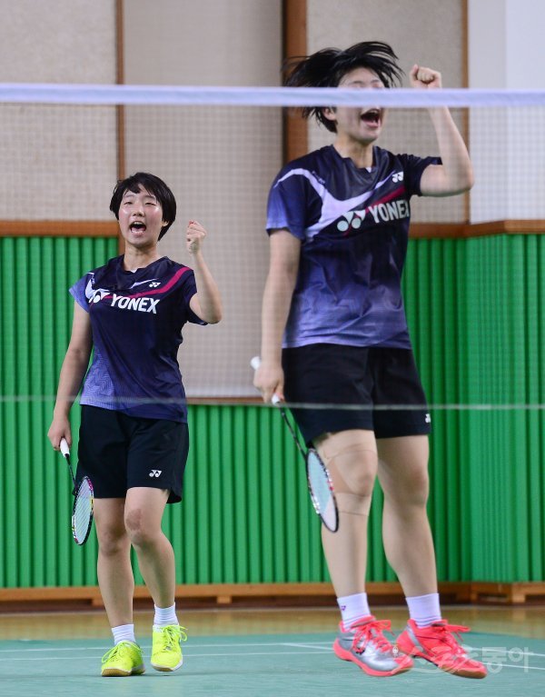 여자고등부 복식 준결승에서 전주성심여고 강지인-이경인(오른쪽) 조가 승리를 확정지은 후 환호하고 있다.