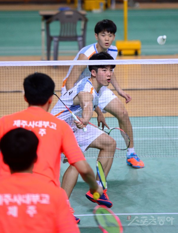 남자고등부 복식 준결승에서 서울체고 김준영-김태환(앞) 조가 리턴을 하고 있다.