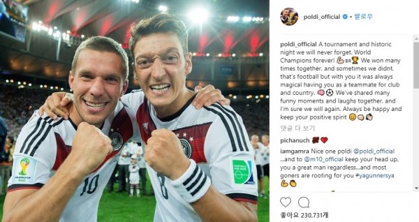 그러자 폴란드 출신으로 독일 대표팀 유니폼을 입고 뛰었던 포돌스키가 외질을 응원하고 나섰다. 포돌스키는 24일 자신의 SNS에 2014 브라질 월드컵 우승 당시 외질과 찍은 사진을 게재하며 “우리가 결코 잊지 못할 토너먼트와 역사적인 밤. 세계 챔피언은 영원하다. 우린 여러번 함께 승리했고, 때로는 그러지 못했지만 너와 클럽과 대표팀 동료로 함께한 순간은 항상 마법 같았다”고 적었다.