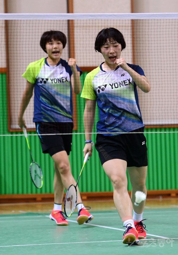 스포츠동아와 동아일보사가 주최하고 한국초등학교배드민턴연맹, 한국중고배드민턴연맹, 한국대학배드민턴연맹이 공동 주관하는 ‘이용대 올림픽 제패기념 2018 화순 전국 학교대항 배드민턴 선수권대회’가 24일 전라남도 화순 이용대 체육관과 하니움문화스포츠센터에서 열렸다. 여자고등부 복식 결승에서 성지여고 김가람(왼쪽)-장민윤 조가 스매싱 공격을 시도하고 있다.