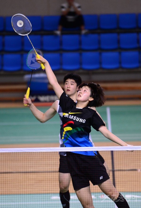 스포츠동아와 동아일보사가 주최하고 한국초등학교배드민턴연맹, 한국중고배드민턴연맹, 한국대학배드민턴연맹이 공동 주관하는 ‘이용대 올림픽 제패기념 2018 화순 전국 학교대항 배드민턴 선수권대회’가 24일 전라남도 화순 이용대 체육관과 하니움문화스포츠센터에서 열렸다. 고등부 혼합복식 결승에서 김문준-김아영(앞) 조가 스매싱 공격을 시도하고 있다.
