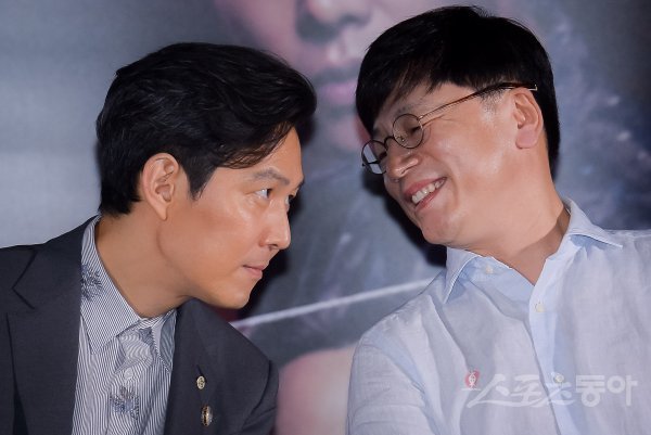 배우 이정재와 김용화 감독(오른쪽)이 24일 서울 송파구 롯데시네마 월드타워에서 열린 영화 ‘신과함께 - 인과 연’ 언론시사회에 참석해 귓속말을 나누고 있다.