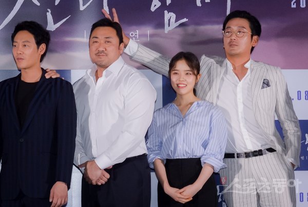 배우 하정우가 24일 서울 송파구 롯데시네마 월드타워에서 열린 영화 ‘신과함께 - 인과 연’ 언론시사회 포토타임에서 마동석에게 장난을 치고 있다.