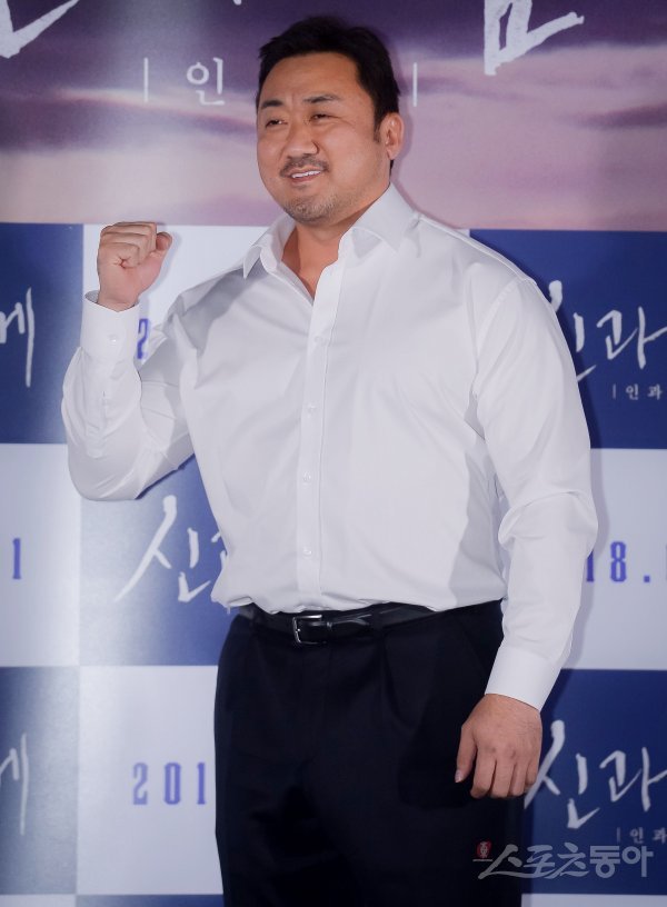 배우 마동석이 24일 서울 송파구 롯데시네마 월드타워에서 열린 영화 ‘신과함께 - 인과 연’ 언론시사회에 참석해 포즈를 취하고 있다.