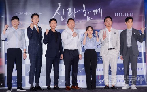 영화 ‘신과함께 - 인과 연’의 연출자인 김용화 감독과 주지훈 김동욱 마동석 김향기 하정우 이정재(왼쪽부터) 등 배우들이 24일 서울 롯데시네마 월드타워에서 열린 시사회에 참석해 파이팅을 외치고 있다. 김진환 기자 kwangshin00@donga.com