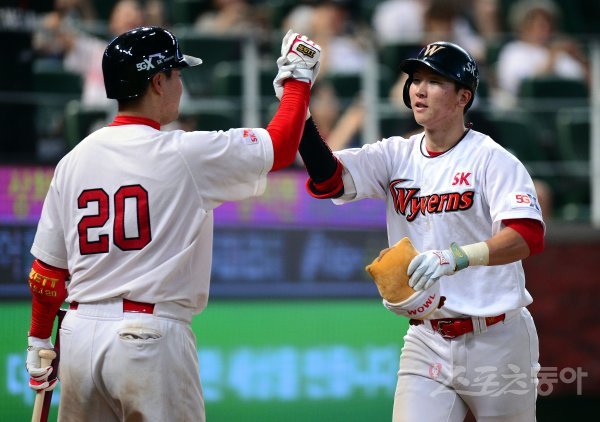 8회말 무사에서 SK 최항이 두산 김강률을 상대로 우월 솔로 홈런을 쏘아 올린 뒤 이재원의 환영을 받고 있다.