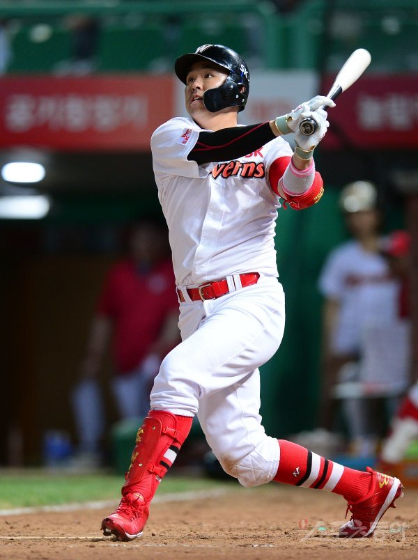 5회말 무사 1루에서 SK 나주환이 두산 최동현을 상대로 좌월 투런 홈런을 쏘아 올리고 있다.
