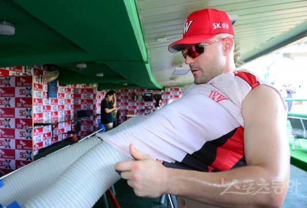 연일 계속되는 폭염에 SK 로맥이 훈련을 마치고 냉풍기 앞에서 더위를 식히고 있다.