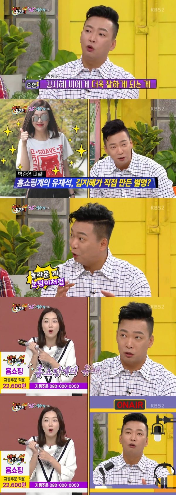 이날 박준형은 김지혜가 홈쇼핑계에서 ‘홈쇼핑계의 유재석’으로 불리는 것에 대해 “사실 그 말을 김지혜 씨가 만든 말이다. 보통은 남이 불러줘야 하는데 자기 스스로 만들었다”며 “놀라운 게 눈덩이처럼 되더라. 지금 홈쇼핑 계의 유재석으로 불린다”고 말했다.
