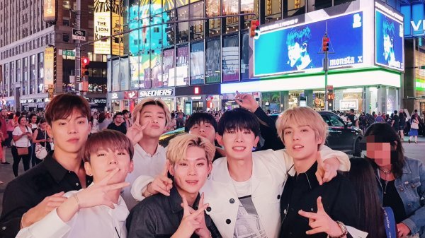 사진 속 몬스타엑스는 자신들의 영상이 게시되고 있는 미국 뉴욕 타임 스퀘어 전광판 앞에서 손가락으로 V 표시를 남기며 보는 이들의 시선을 집중시킨다. 몬스타엑스는 인파 속에서도 눈에 띄는 훈훈한 비주얼과 함께 밝은 미소로 매력을 더한다.