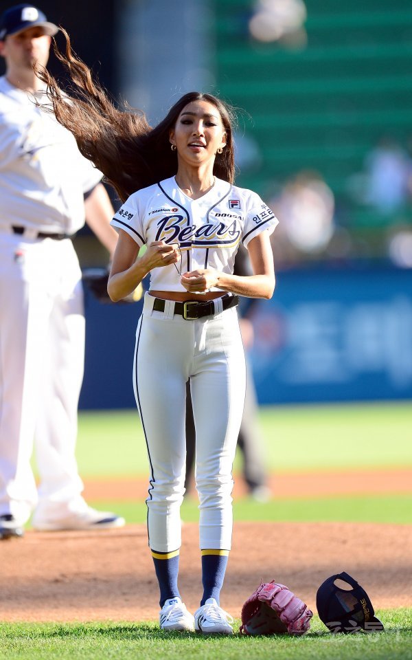 경기 전 모델 문가비가 시구를 마치고 머리카락을 풀고 있다.