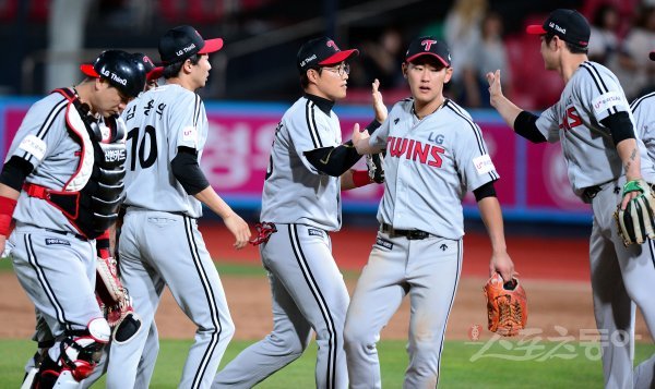 LG가 kt에 7-4로 승리한 뒤 선수들이 그라운드에서 기쁨을 나누고 있다.