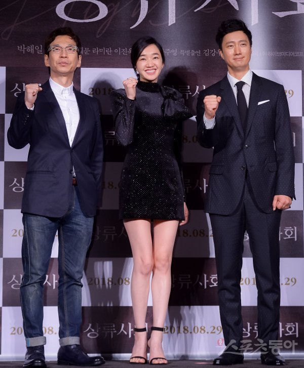 변혁 감독과 배우 수애, 박해일(왼쪽부터)이 31일 서울 광진구 롯데시네마 건대입구에서 열린 영화 ‘상류사회’ 제작보고회에 참석해 포즈를 취하고 있다.