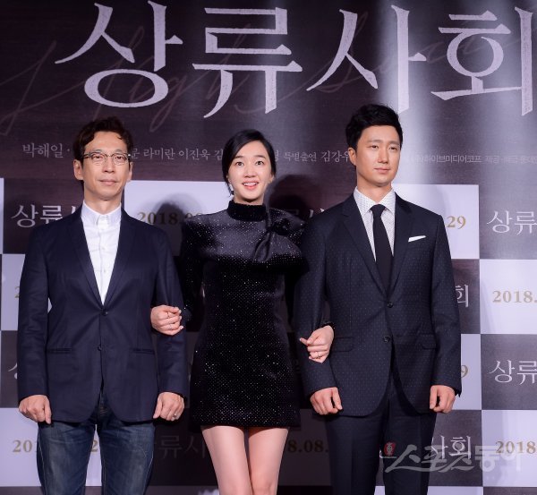 변혁 감독과 배우 수애, 박해일(왼쪽부터)이 31일 서울 광진구 롯데시네마 건대입구에서 열린 영화 ‘상류사회’ 제작보고회에 참석해 포즈를 취하고 있다.
