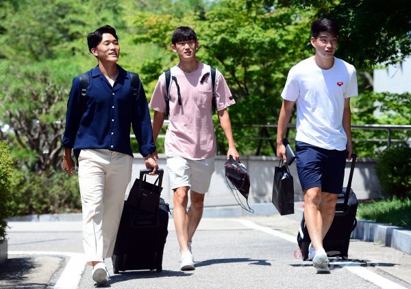 2018 자카르타-팔렘방 아시안게임에 출전하는 남자 축구대표팀 나상호(왼쪽부터), 이승모, 김정민이 31일 파주 축구국가대표팀트레이닝센터(NFC)에 소집되고 있다.