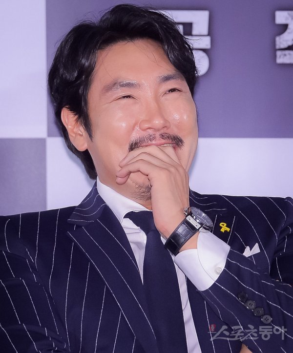 배우 조진웅이 31일 서울 용산구 CGV 용산아이파크몰에서 열린 영화 ‘공작’ 언론시사회 및 기자간담회에서 웃음을 참고 있다.