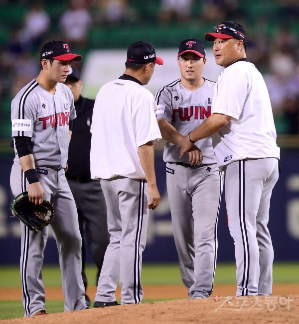 6회말 1사 2루 LG 신정락이 두산 정진호의 타구에 맞아 교체되고 있다.