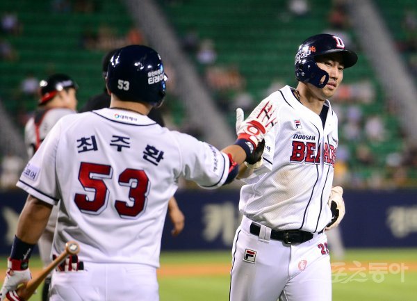6회말 1사 2루 두산 허경민 적시타 때 득점한 정진호가 하이파이브 하고 있다.