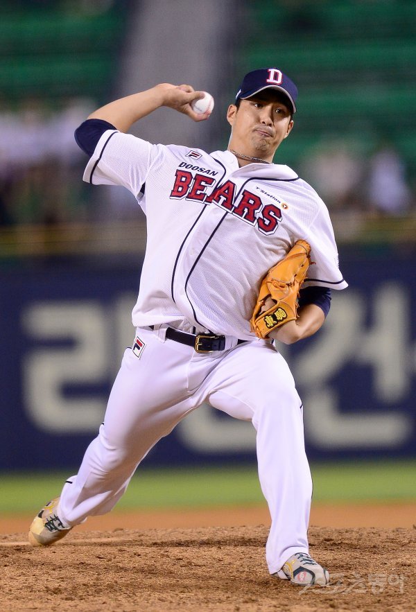 NC에서 트레이드 온 두산 윤수호가 9회초 2사 상황에서 등판해 역투하고 있다.