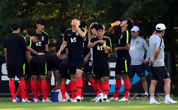 축구대표팀 선수들이 훈련도중 무더위에 음료를 마시고 있다.