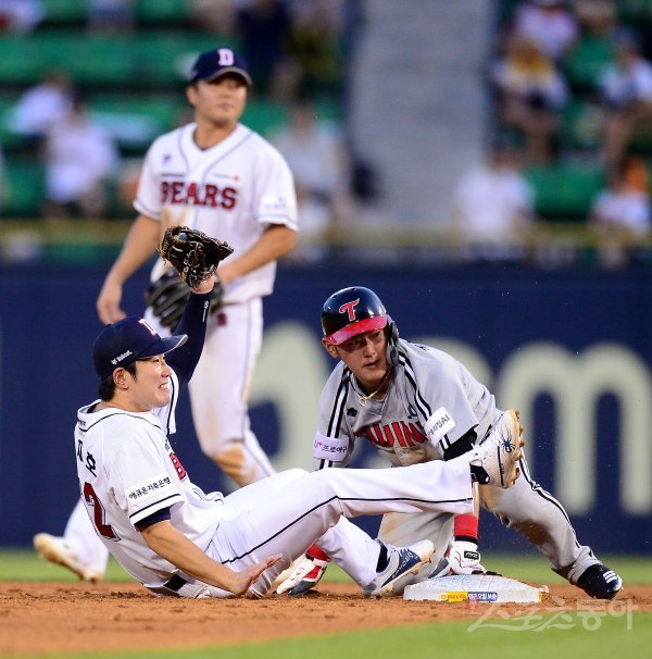 3회초 1사 1루 상황에서 LG 정주현이 2루 도루에 성공하고 있다.