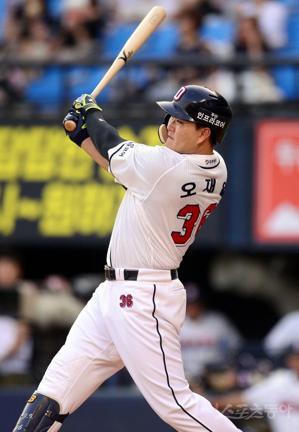 2회말 무사 1루 두산 오재일이 동점을 만드는 1타점 중전 2루타를 치고 있다.