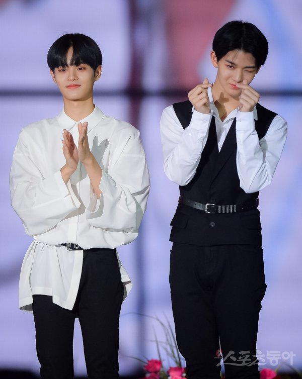 그룹 워너원의 이대휘와 배진영(오른쪽)이 1일 서울 고척스카이돔에서 열린 ‘케이스타 2018 코리아 뮤직 페스티벌‘의 포토타임에 참석해 포즈를 취하고 있다.