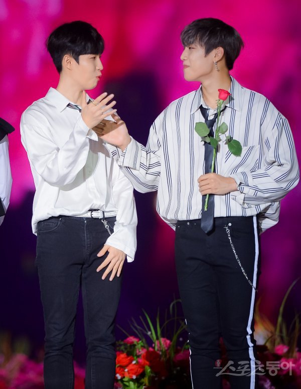 그룹 워너원의 김재환과 박우진(오른쪽)이 1일 서울 고척스카이돔에서 열린 ‘케이스타 2018 코리아 뮤직 페스티벌‘의 포토타임에 참석해 포즈를 취하고 있다.