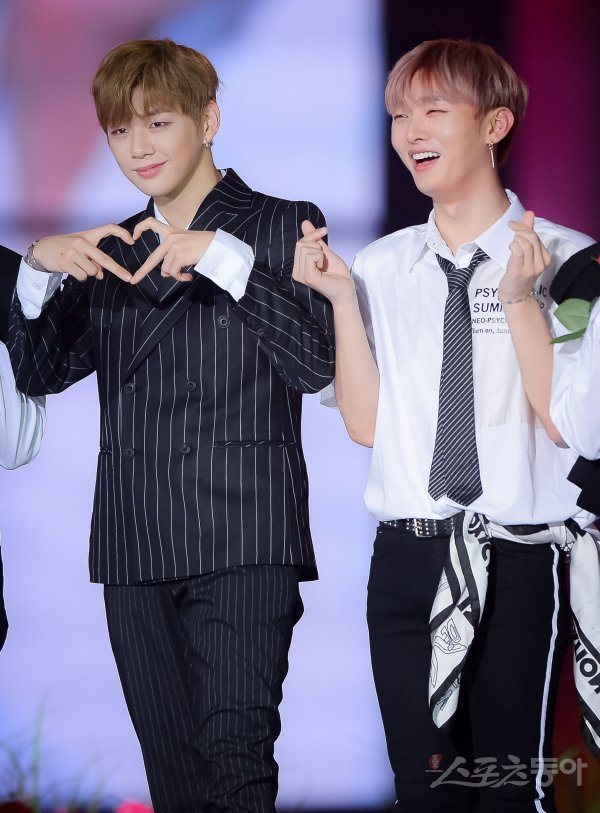 그룹 워너원의 강다니엘과 윤지성(오른쪽)이 1일 서울 고척스카이돔에서 열린 ‘케이스타 2018 코리아 뮤직 페스티벌‘의 포토타임에 참석해 포즈를 취하고 있다.