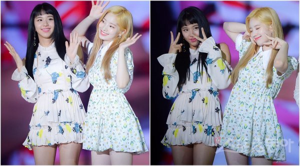 그룹 트와이스의 채영과 다현(오른쪽)이 1일 서울 고척스카이돔에서 열린 ‘케이스타 2018 코리아 뮤직 페스티벌‘의 포토타임에 참석해 포즈를 취하고 있다.