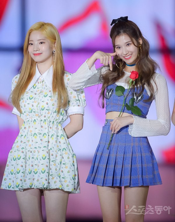 그룹 트와이스의 사나(오른쪽)가 1일 서울 고척스카이돔에서 열린 ‘케이스타 2018 코리아 뮤직 페스티벌‘의 포토타임에 참석해 포즈를 취하고 있다.