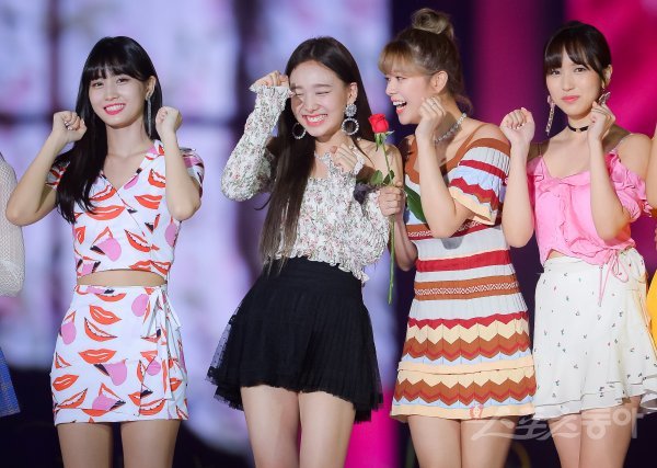 그룹 트와이스의 모모와 나연, 정연, 미나(왼쪽부터)가 1일 서울 고척스카이돔에서 열린 ‘케이스타 2018 코리아 뮤직 페스티벌‘의 포토타임에 참석해 포즈를 취하고 있다.