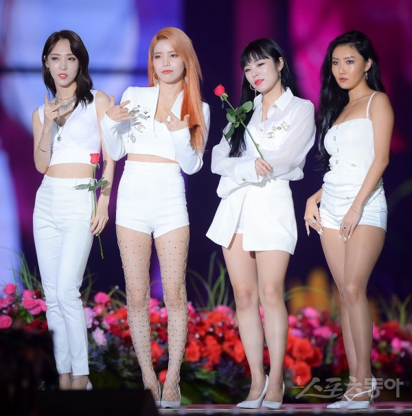 그룹 마마무의 문별과 솔라, 휘인, 화사(왼쪽부터)가 1일 서울 고척스카이돔에서 열린 ‘케이스타 2018 코리아 뮤직 페스티벌‘의 포토타임에 참석해 포즈를 취하고 있다.