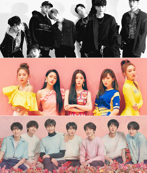 여름을 지배할 ‘음원 강자’가 잇달아 돌아온다. 아이콘과 레드벨벳 그리고 방탄소년단(위쪽부터)이 차례로 새 음반을 내고 막바지 여름대전에 나선다. 사진제공|YG엔터테인먼트·SM엔터테인먼트·빅히트엔터테인먼트