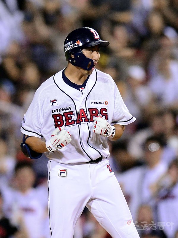 5회말 2사 만루 두산 정진호가 2타점 적시타를 치고 1루에서 환호하고 있다.
