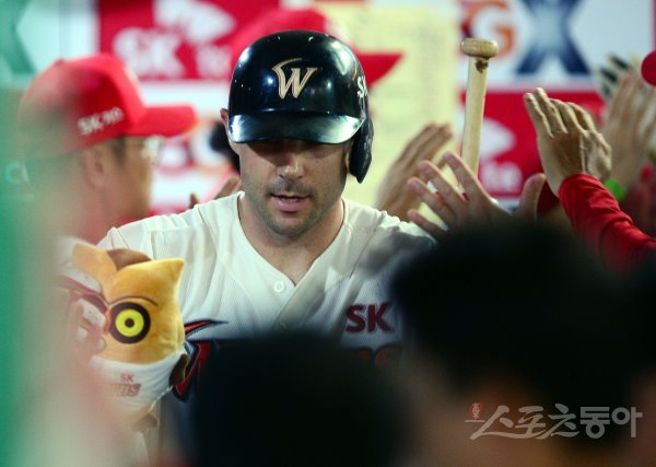 6회말 무사 1, 2루에서 SK 로맥이 넥센 이승호를 상대로 좌월 3점 홈런을 쏘아 올린 뒤 동료들의 환영을 받고 있다.