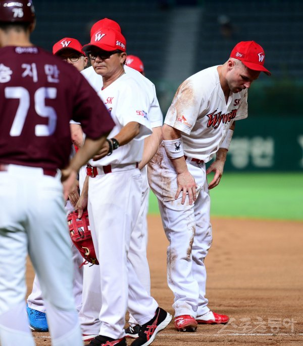 6회초 무사에서 넥센 임병욱의 내야안타 때 수비하던 SK 로맥이 볼에 맞아 고통을 호소하고 있다.