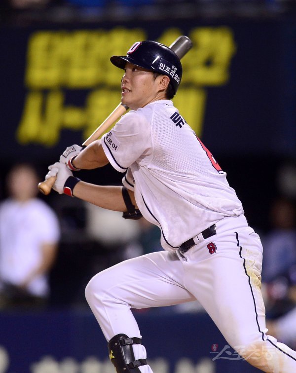 6회말 2사 1,3루 두산 류지혁이 1타점 좌전 안타를 치고 있다.