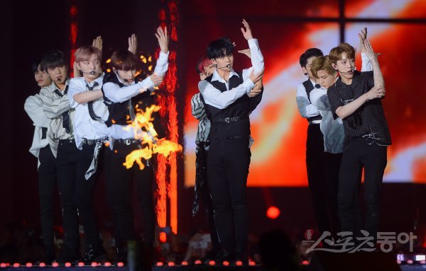 워너원이 1일 서울 고척스카이돔에서 열린 ‘케이스타 2018 코리아 뮤직 페스티벌’에서 열정적인 무대를 펼치고 있다.