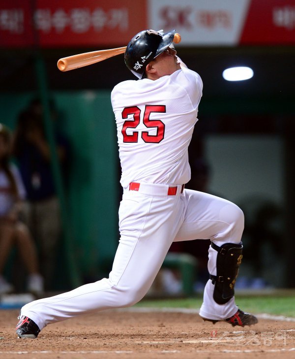 8회말 1사 1, 3루에서 SK 강지광이 타석에 들어서 유격수 플라이 타구를 날리고 있다.