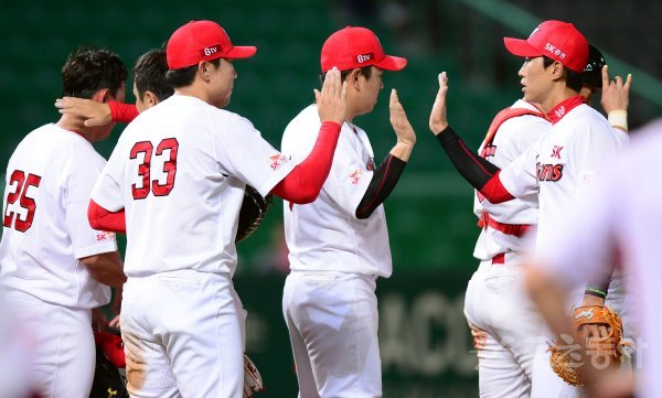 SK가 넥센에 14-8로 승리한 뒤 선수들이 그라운드에서 기쁨을 나누고 있다.