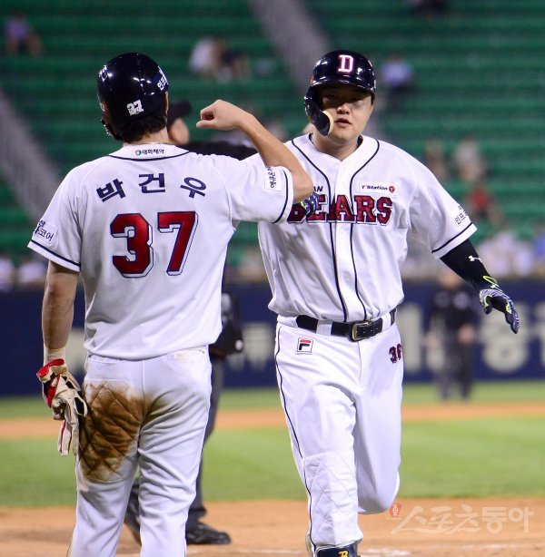 7회말 1사 2루 두산 오재일이 좌중월 투런 홈런을 날리고 그라운드를 돌아 홈인해 하이파이브하고 있다.