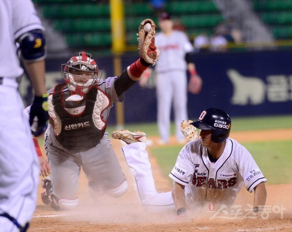 7회말 1사 2,3루 두산 양의지 희생플라이 때 3루주자 황경태가 태그업 시도해 홈에서 세이프되고 있다.