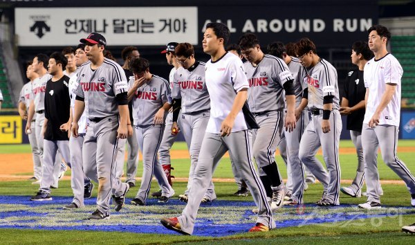 8-14로 패하며 올 시즌 두산전 10전 10패를 당한 LG 선수들이 더그아웃으로 들어가고 있다.