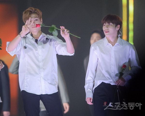 워너원 강다니엘이 1일 서울 고척스카이돔에서 열린 ‘케이스타 2018 코리아 뮤직 페스티벌’ 을 마친 후 팬들에게 인사를 하고 있다.