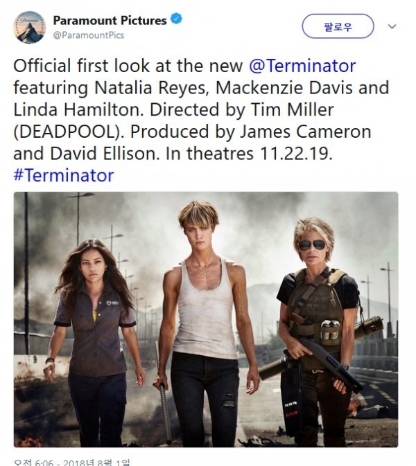 파라마운트는 1일(현지시각) 트위터에 나탈리아 레예스, 맥켄지 데이비스, 린다 해밀턴의 스틸컷을 공개했다. 특히 ‘터미네이터1’(1984)와 ‘터미네이터 : 심판의 날’(1991)에서 사라 코너 역으로 출연한 린다 해밀턴이 27년 만에 시리즈에 복귀해 눈길을 끈다.
